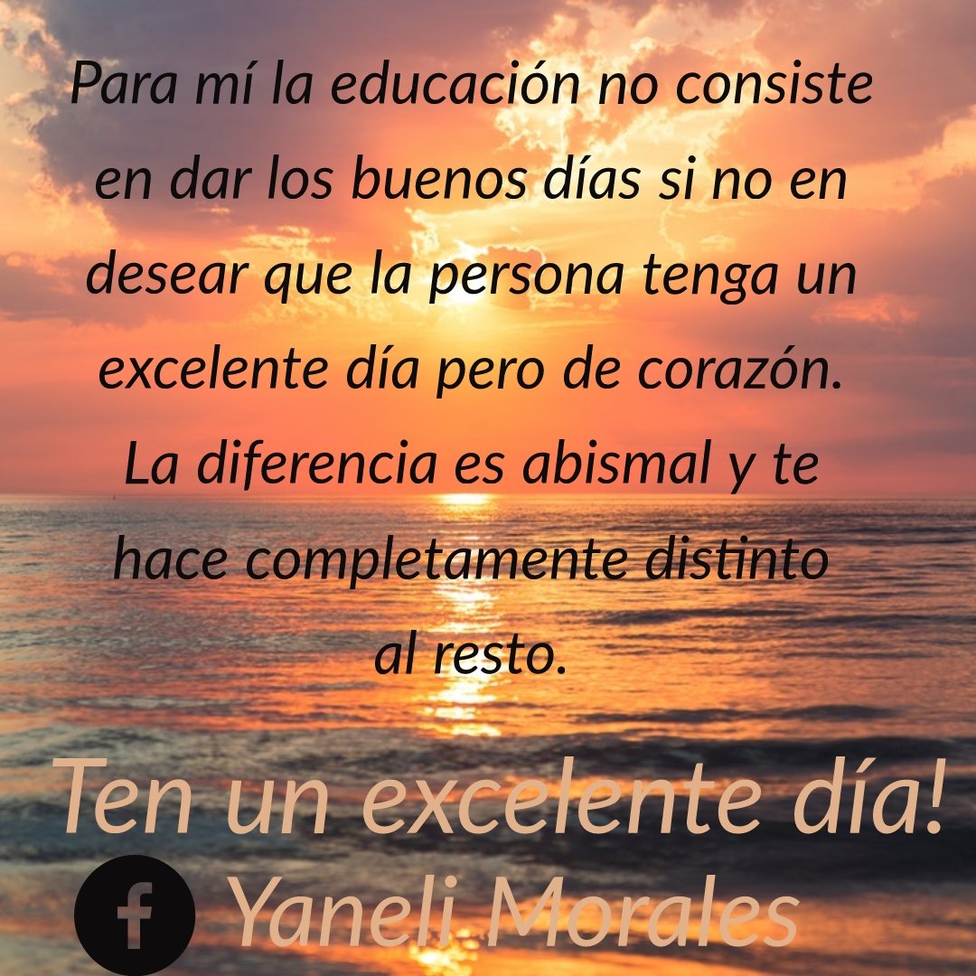 Seamos distintos al resto. Hagamos la diferencia. La educación no puede ser sólo formalidad. Vamos a imprimirle un poco de buena vibra y buenos sentimientos. Buenos días con alegría 🌟. Ten un excelente día. Pasa los buenos deseos. No te quedes con ellos.