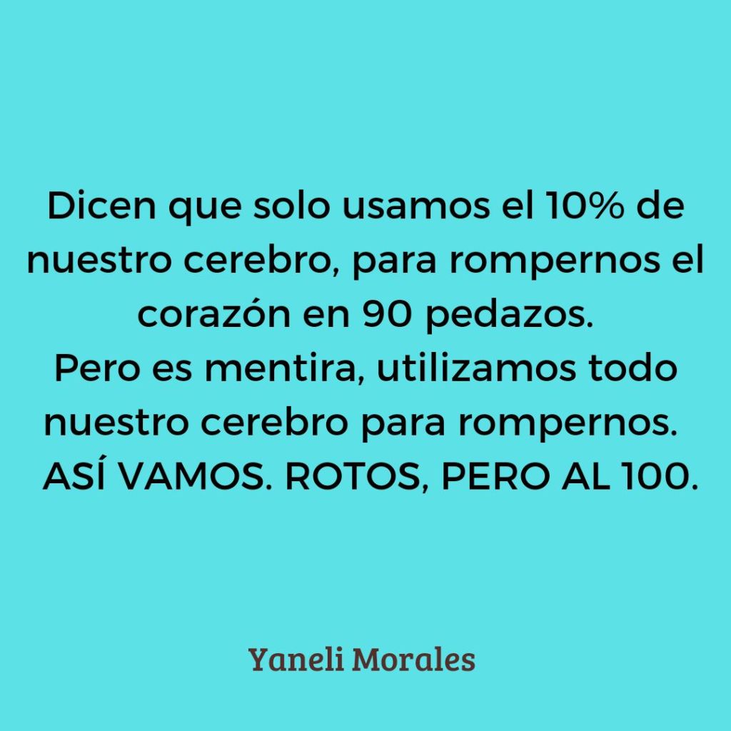Lo irónico es que usamos ese 100% de nuestras regiones cerebrales para rompernos el corazón en 100 pedazos, para culparnos, autoflagelarnos y depender de otras personas.